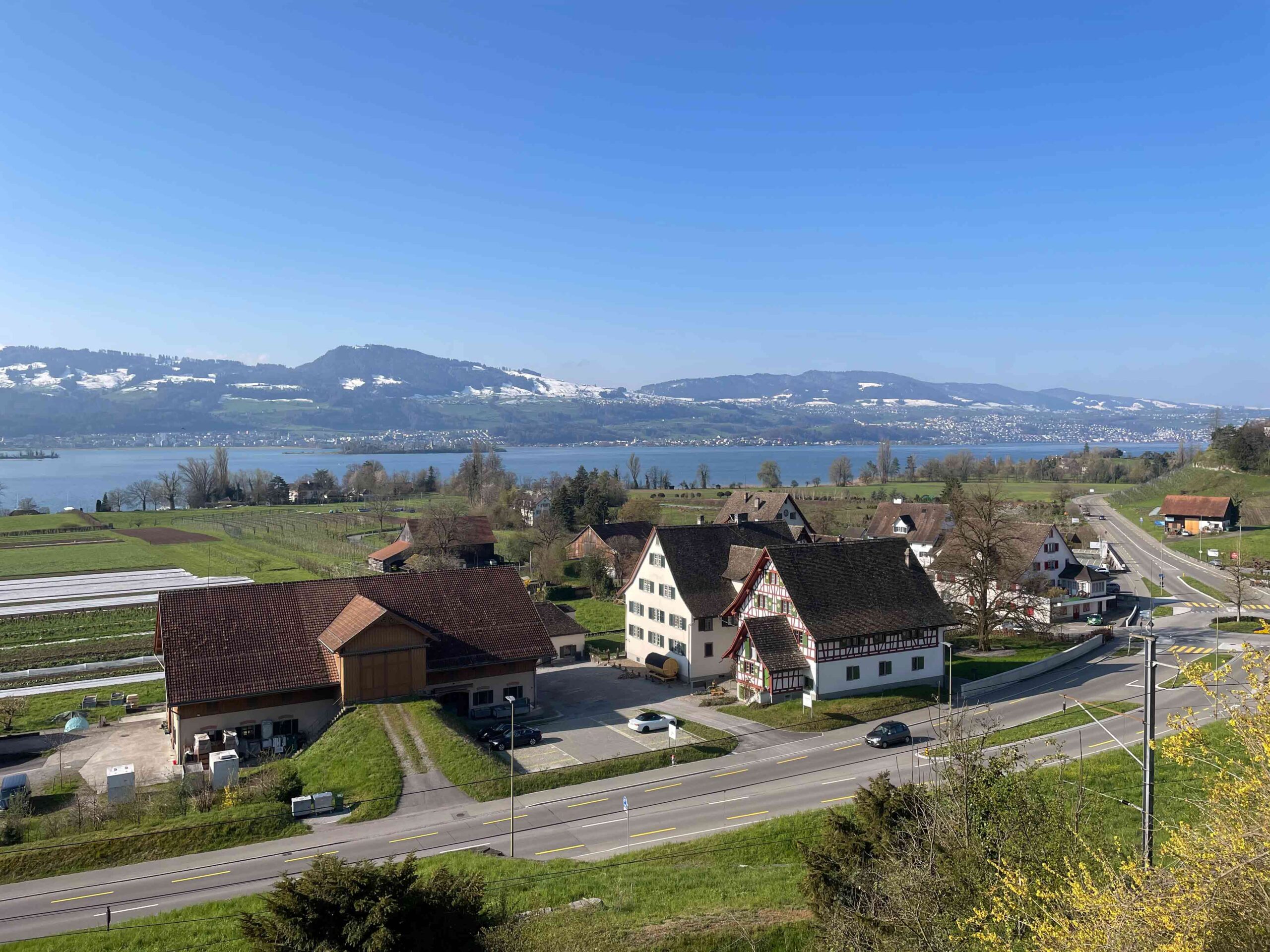 Das Oberhaus mit Trotte und grosser Scheune liegt nahe vom Kreisel in Feldbach. Zwischen der Seestrasse und dem See stehen in Feldbach nur die Häuser aus dem 17. und 18. Jahrhundert, keine Neubauten weit und breit.